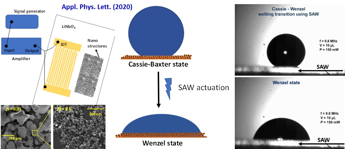 Cassie-Wenzel wetting transition on nanostructured superhydrophobic surfaces induced by surface acoustic waves, A. Sudeepthi, L. Yeo and A. K. Sen, Applied Physics Letters, 2020.